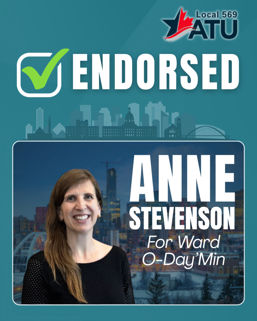 Now seeking a second term on City Council, Anne Stevenson is ATU’s choice in O-DAY’Min. When we look at Anne’s impressive body of education and experience, we can’t imagine NOT endorsing this exceptional woman. A Masters Degree in City Design from the London School of Economics? Worked in Industrial Land Use in Vancouver. Seven years experience working for the City of Edmonton Planning. A body of experience and education that serves the people of Edmonton and ATU members incredibly well.
