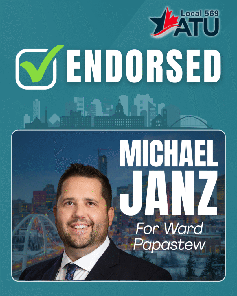 An identifiable energy source powering the City of Edmonton forward into the future, Michael Janz has been there every single time supporting the issues that matter most to ATU members. This is a no-brainer for us as Michael stood strong to defeat the poorly thought out Regional Transit scheme and the poorly thought out Reimagine scheme and the contracting out of our bus cleaners. Strong on Transit, Strong on workers’ issues and strong on the municipal services on which we all depend. It’s Michael Janz for Ward Papastew.