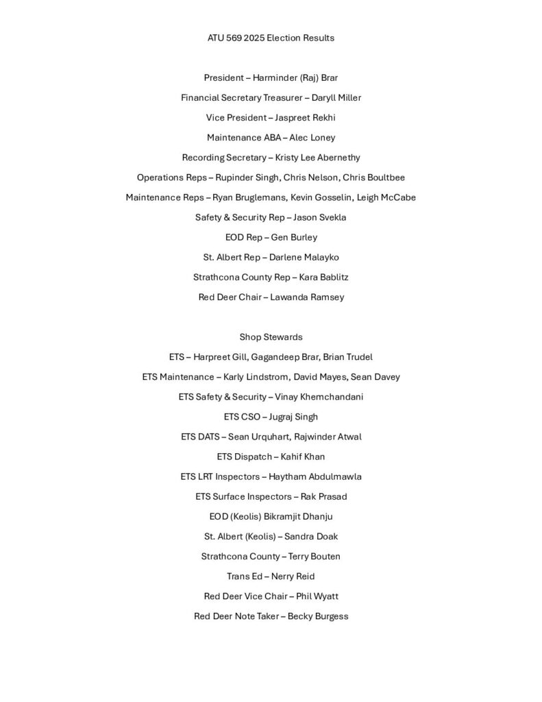ATU 569 2025 Election Results Posted by Daniel on 2025-12-052025-12-05 For a breakdown of the election results by voting location, see below: ATU 569 Election 2025: Officers and Executive Board Members ATU 569 Election 2025: Shop Stewards and Others